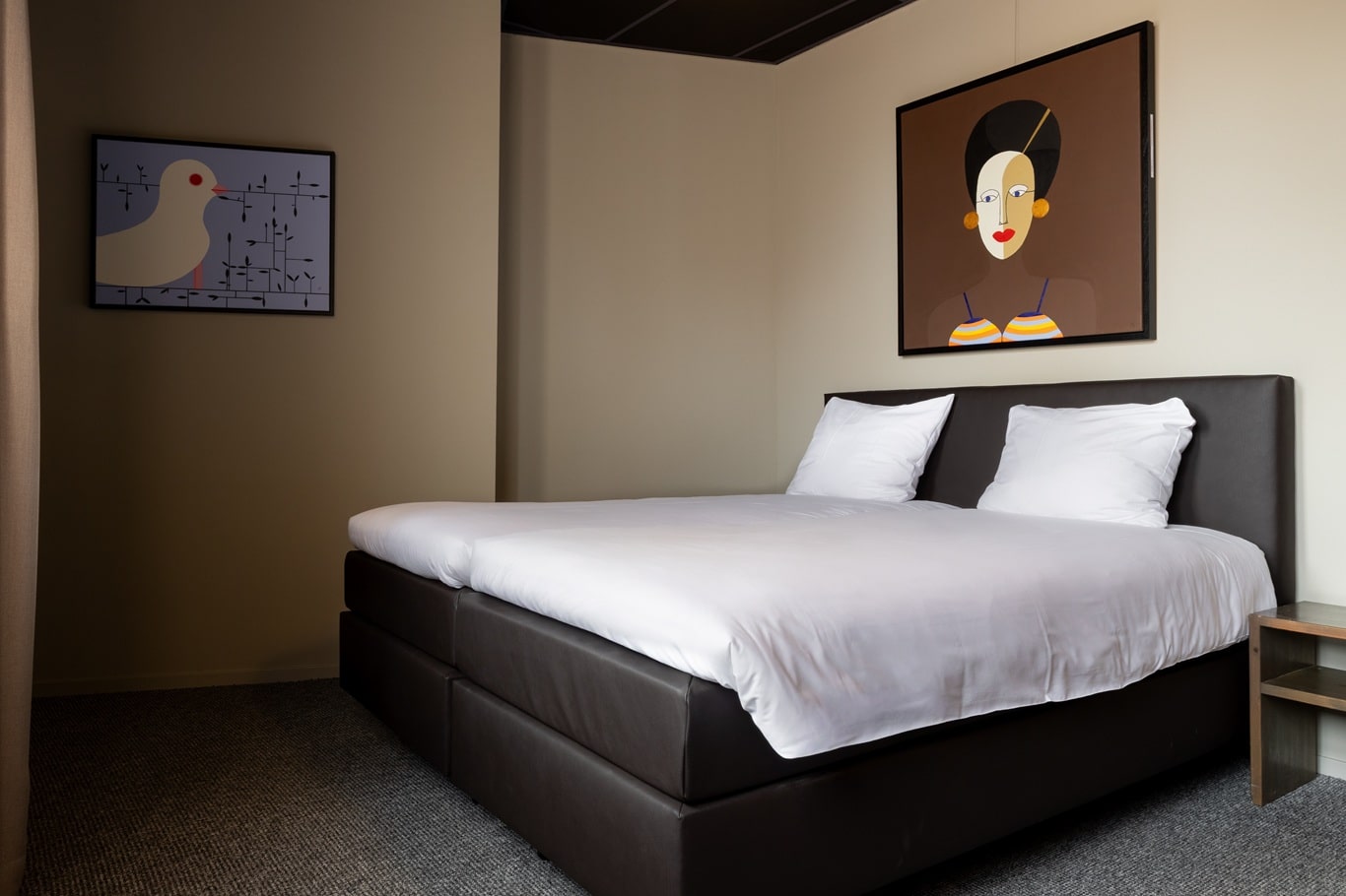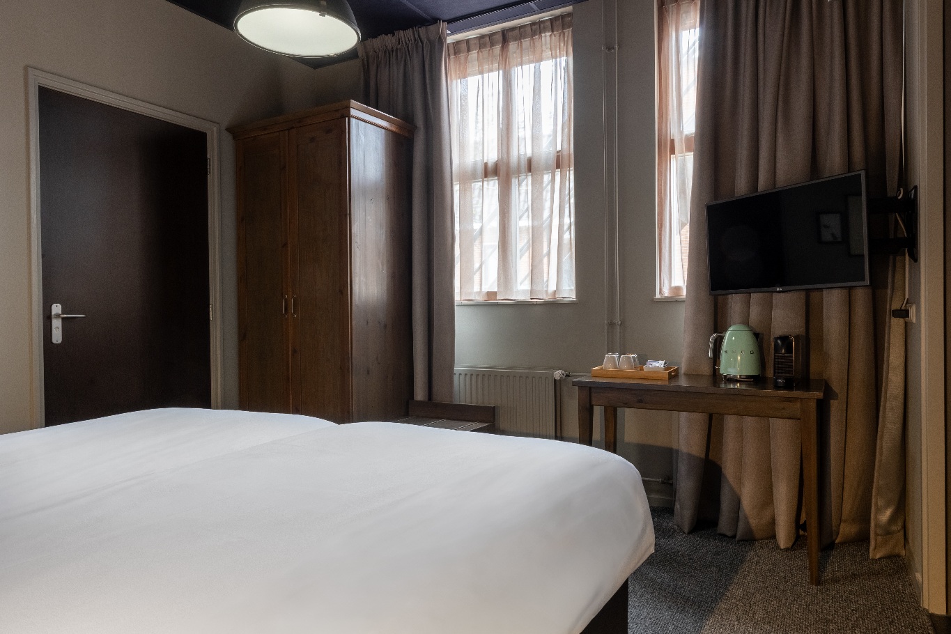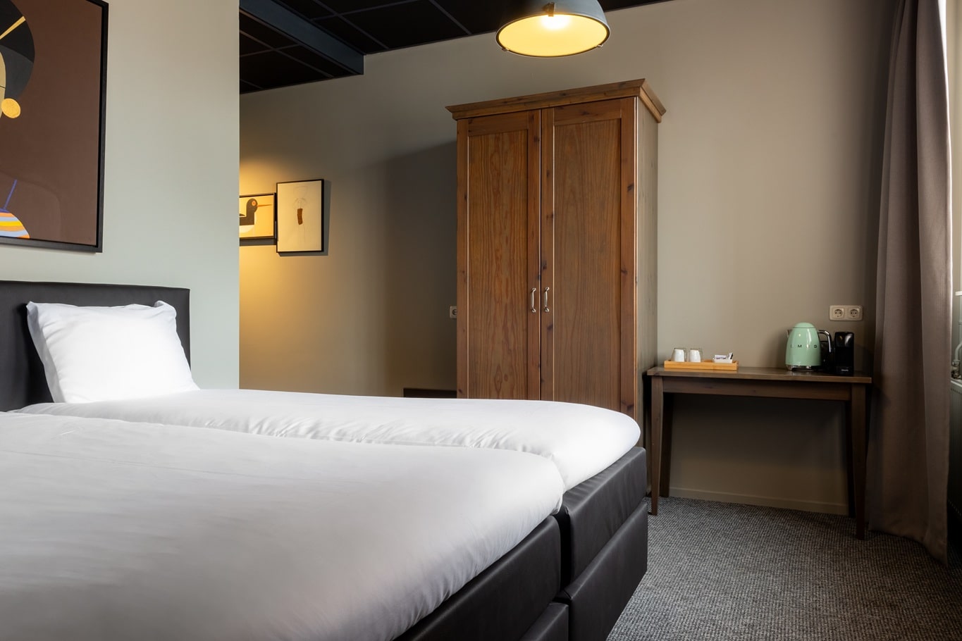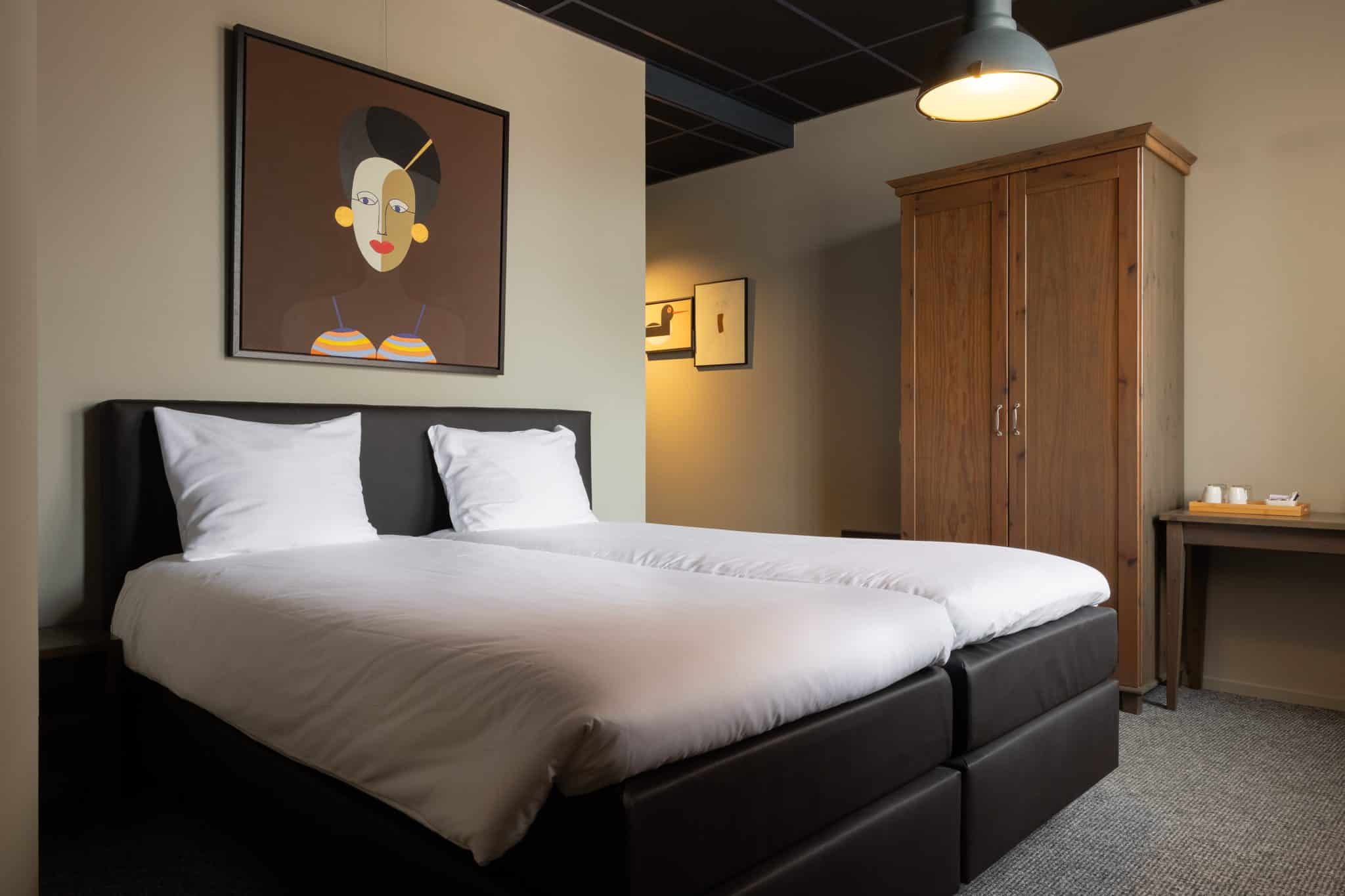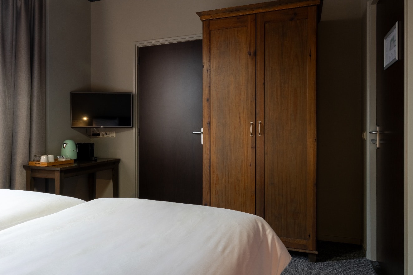 Deze comfortabele kamer van 16 m² op de 1ste etage grond is met zorg ingericht voor een ontspannen verblijf. Geniet van het kingsize Avek-bed en een ruime badkamer, voorzien van producten van Marie-Stella-Maris. Koffie- en theefaciliteiten vind je in de koffiecorner.